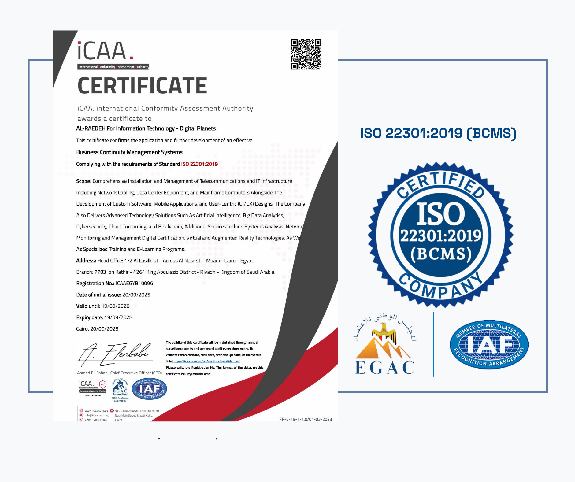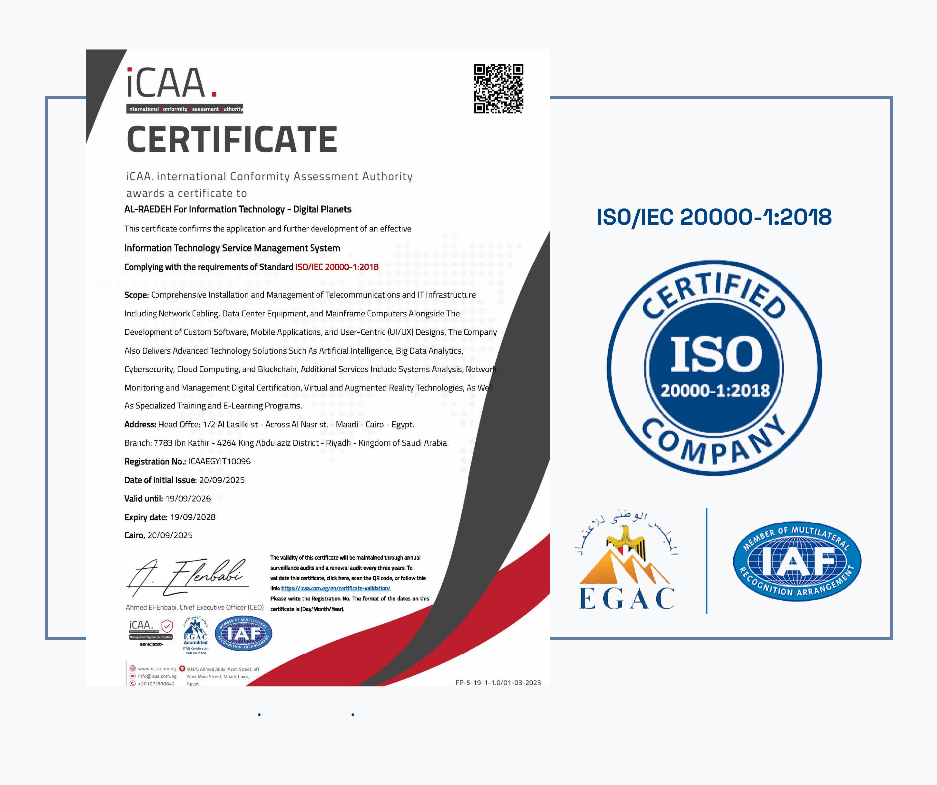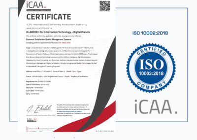 الشهادات شهادات ديجيتال بلانيتس شريك نجاحك المؤهل والموثوق الشهادات الجودة هي ركيزة أساسية لشركة Digital Planets ونحن نعمل باستمرار على ترقية معايير السوق ثقة نفتخر بها — من شهادات عملائنا نحن نُجيد فن الاستشارات حلول مصممة خصيصًا لاحتياجات أعمالكرؤيتك… خبرتنا… والنتيجه: كيان متطور رقميا بشكل امن ابدأ الأن